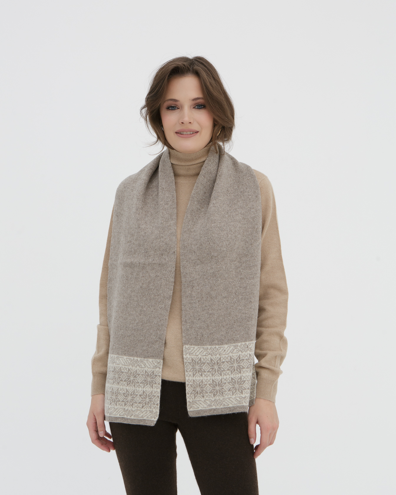 Классическая прямоугольная форма с аккуратной вязкой и декоративной полосой по краям. Минималистичный дизайн позволяет легко комбинировать аксессуар с верхней одеждой, пальто, жакетами и свитерами.