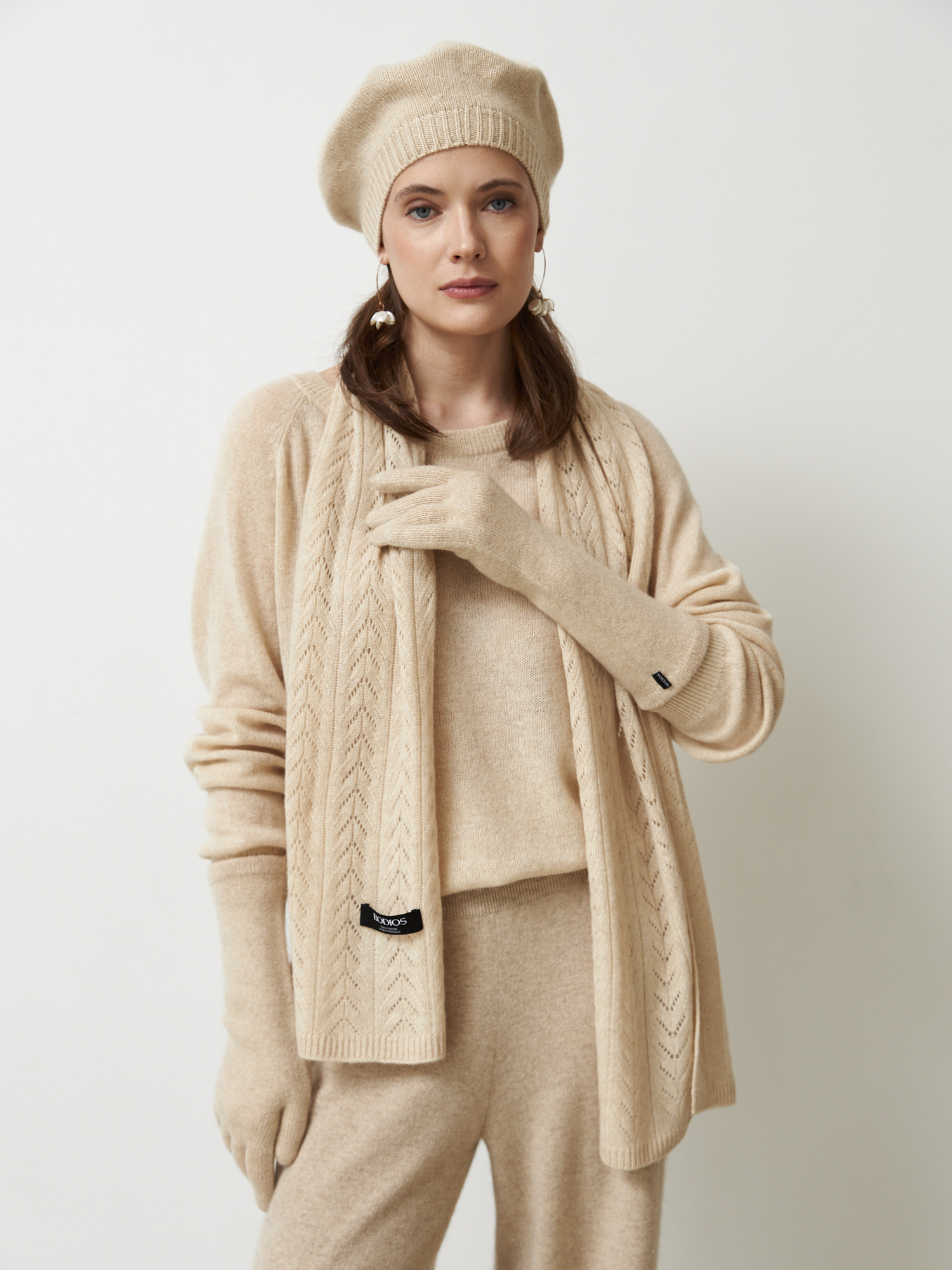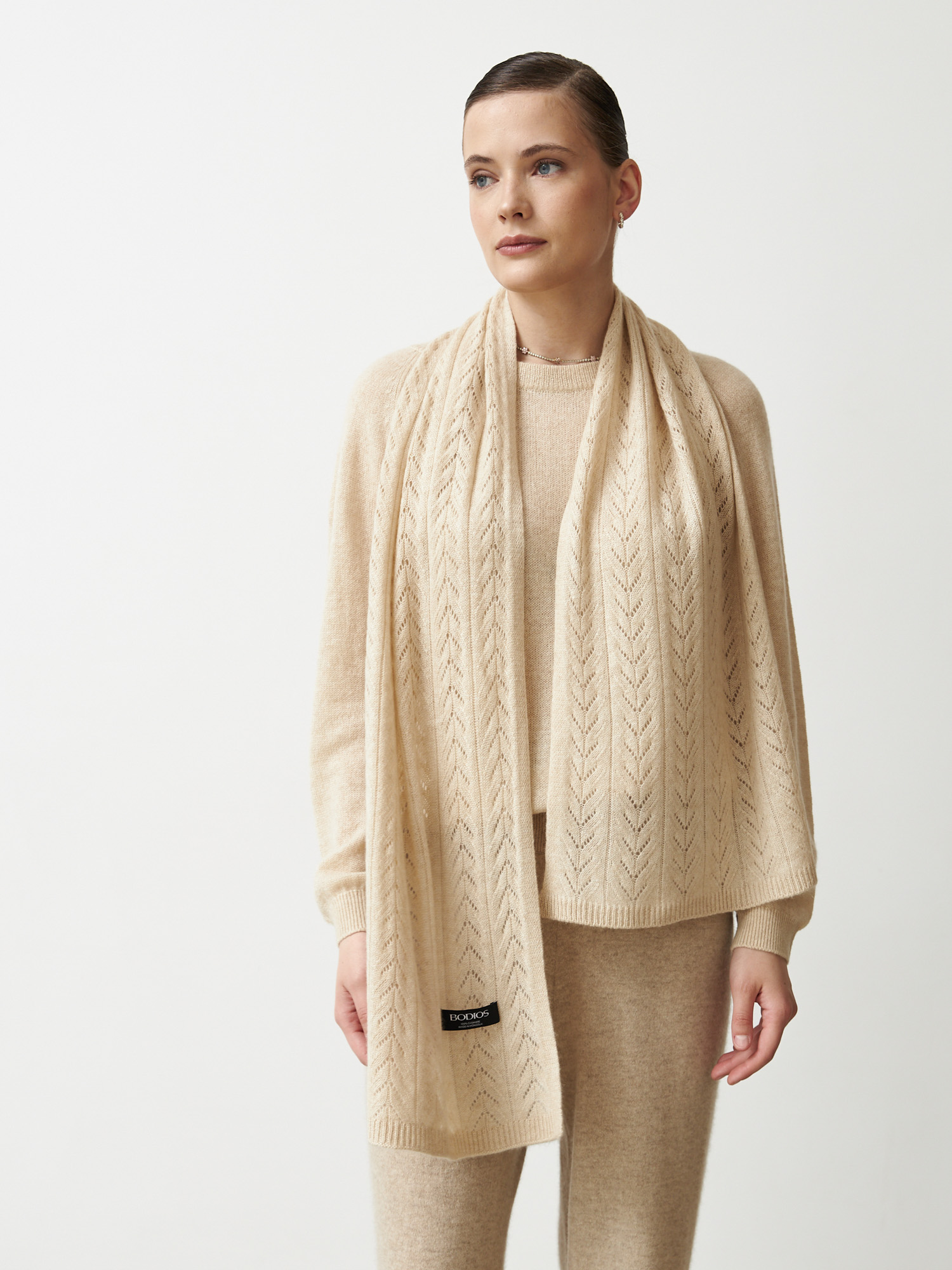 Модель выполнена в классической прямоугольной форме с изящным фактурным узором в виде вертикальной косы. Декоративная вязка придаёт аксессуару глубину и подчёркивает натуральную текстуру кашемира.