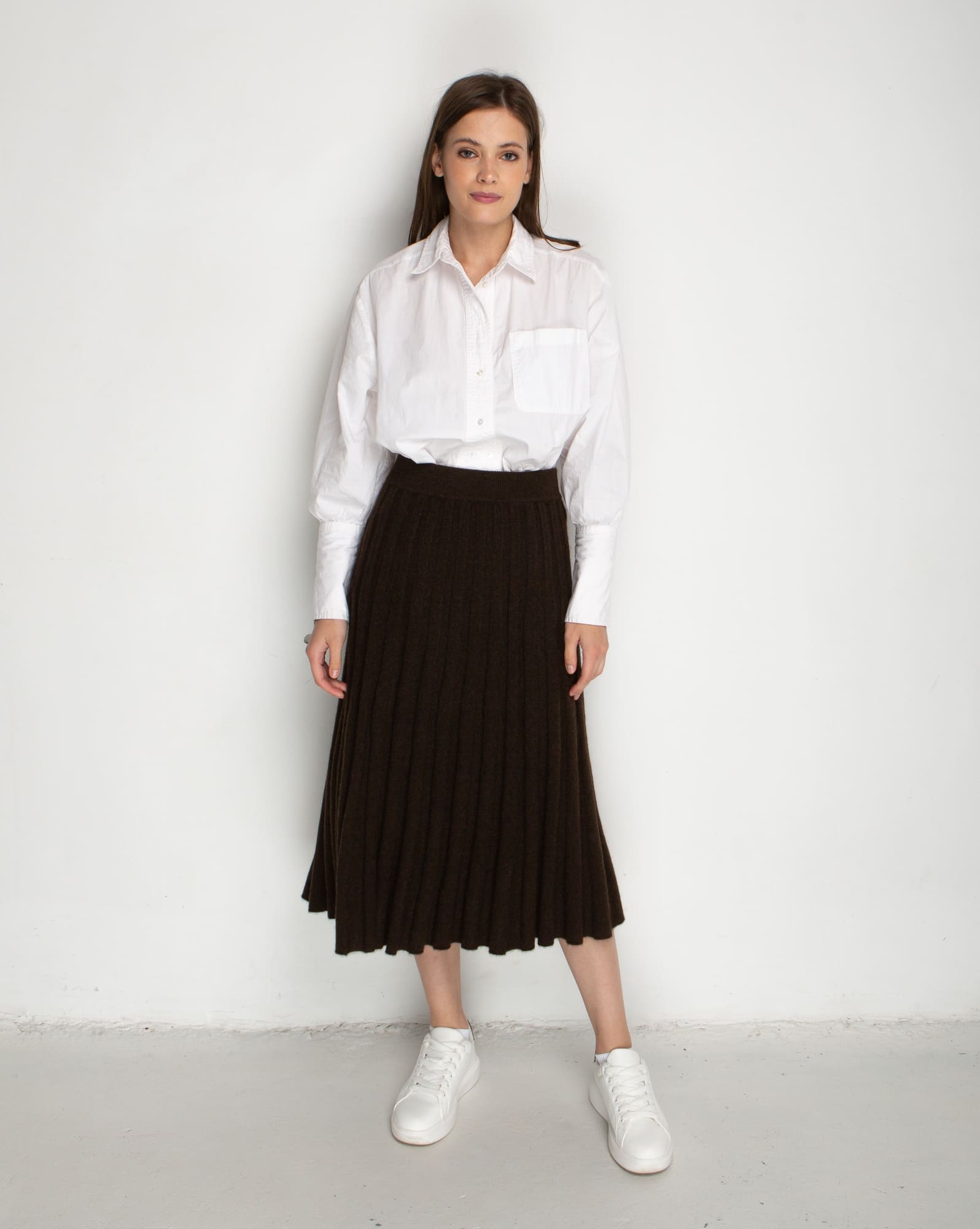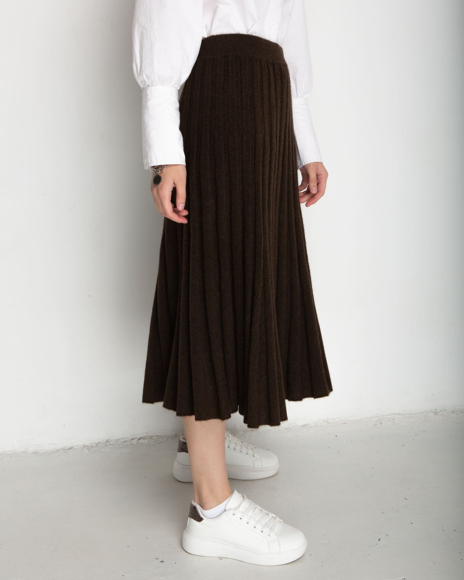Юбка из пуха яка — элегантная модель с выразительной плиссировкой, создающая лёгкий и динамичный силуэт. Подходит для женственных и современных образов на каждый день.