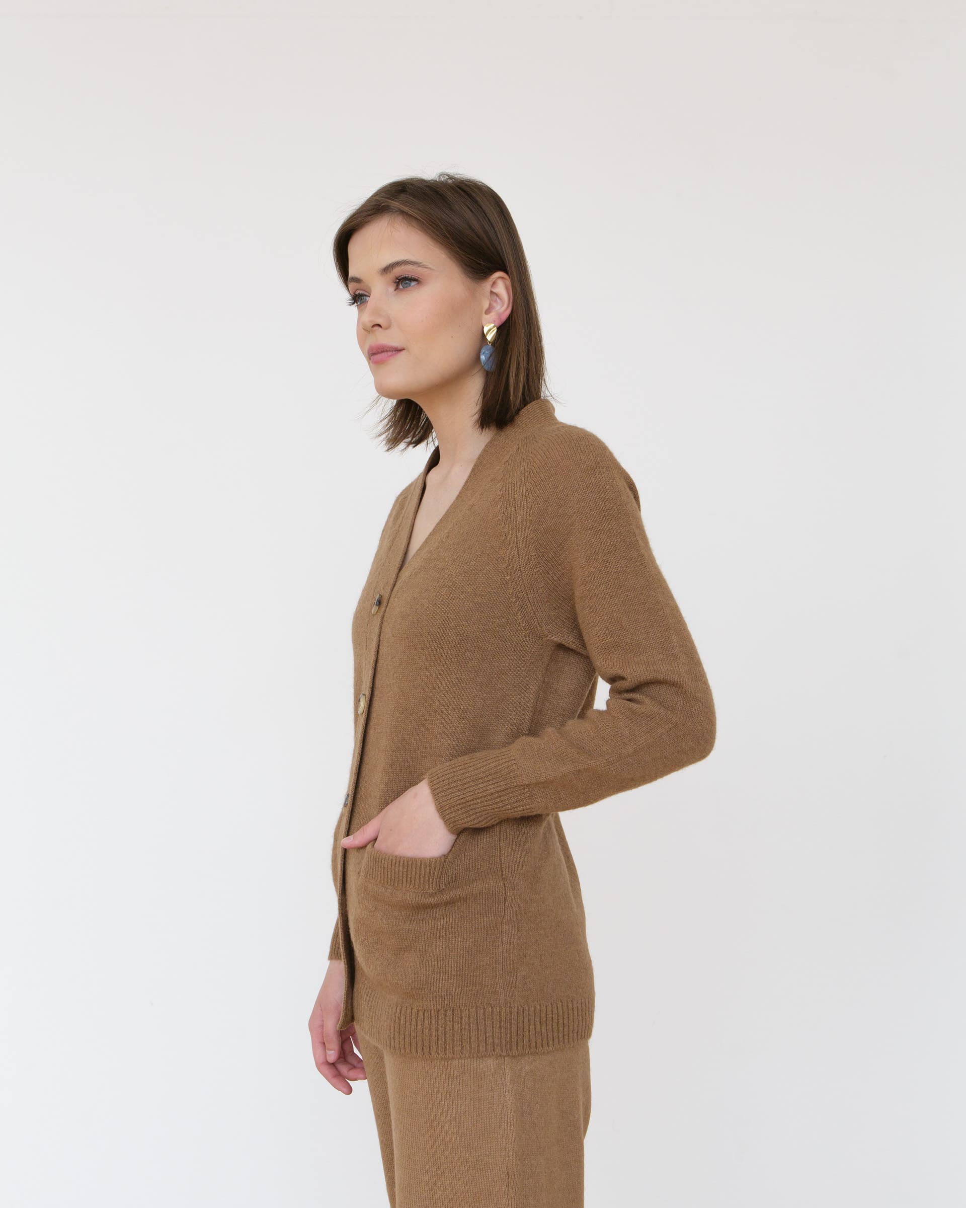 Классический удлиненный V-образный кардиган на пуговицах с внешними карманами