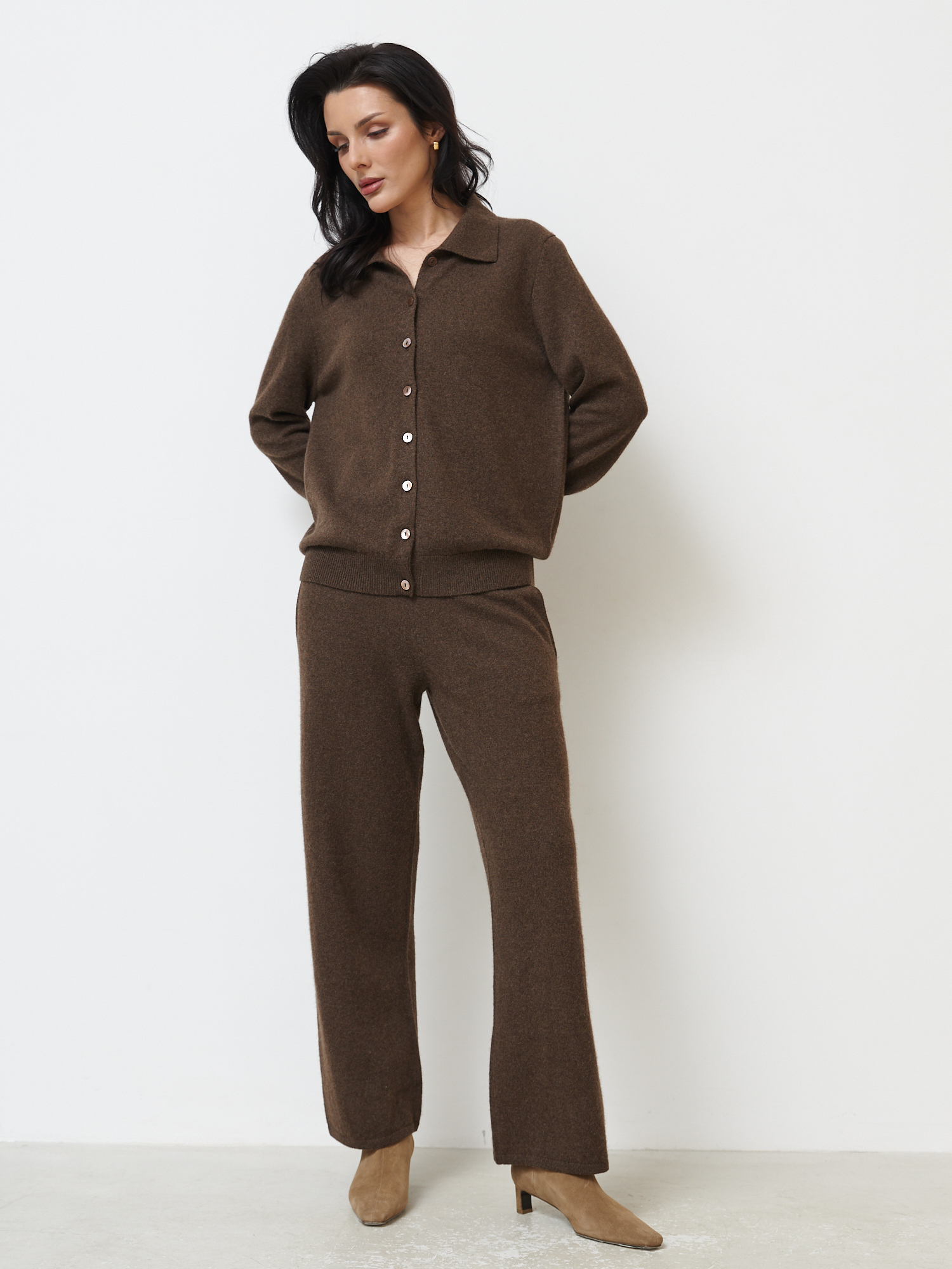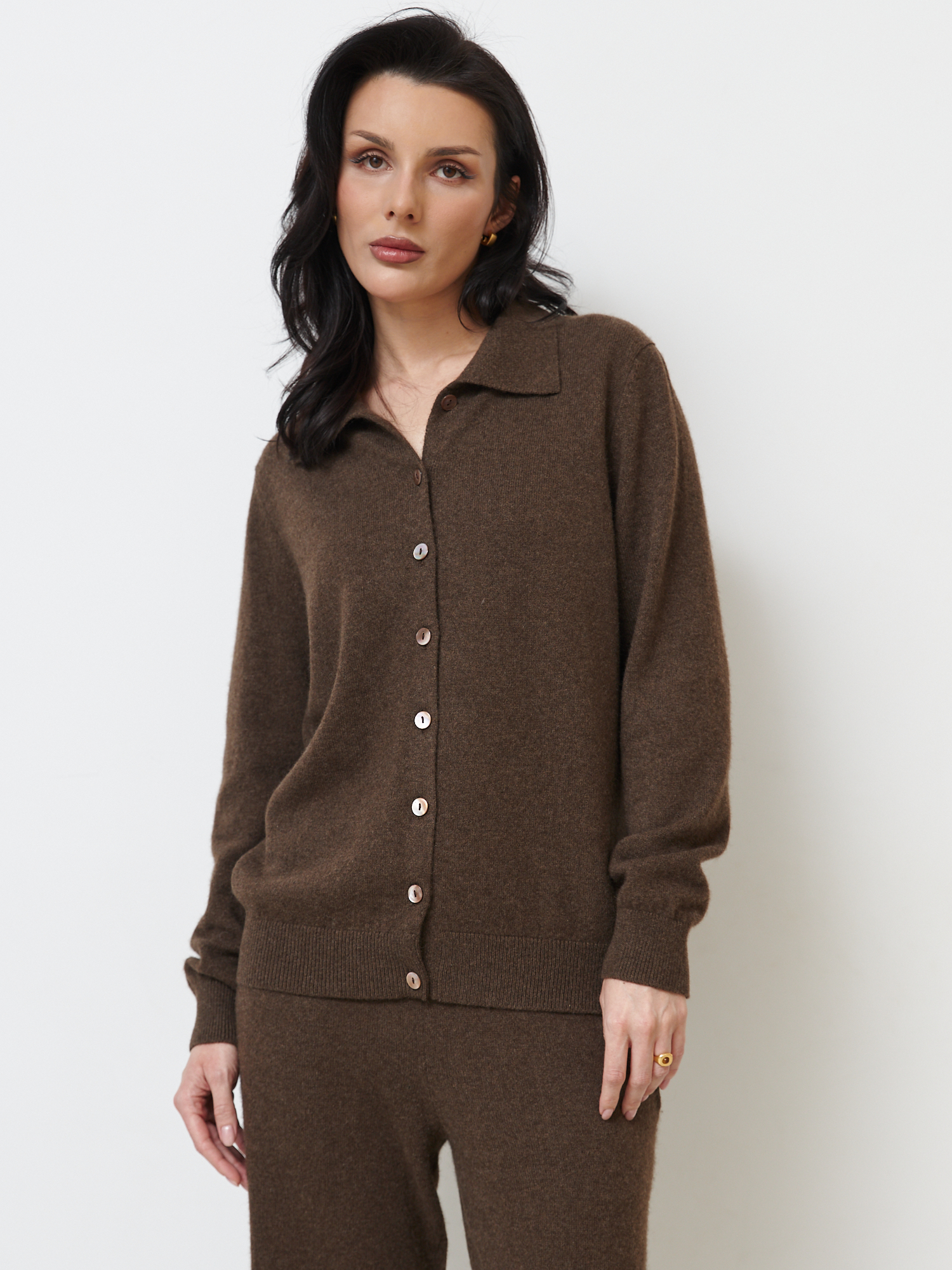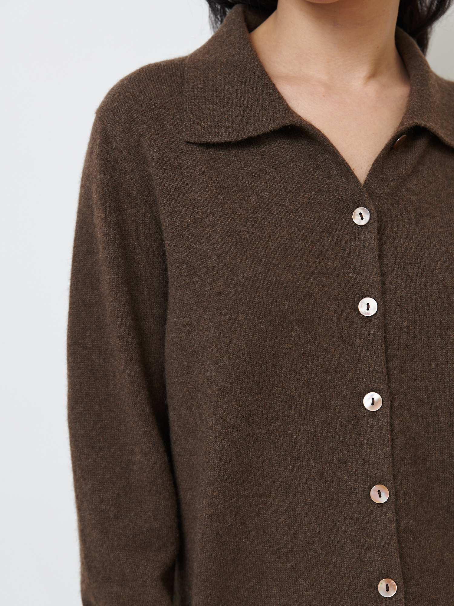 Прямой силуэт с классическим отложным воротником. Застёжка на пуговицы придаёт модели аккуратный и универсальный вид, позволяя носить кардиган как самостоятельно, так и в многослойных образах.