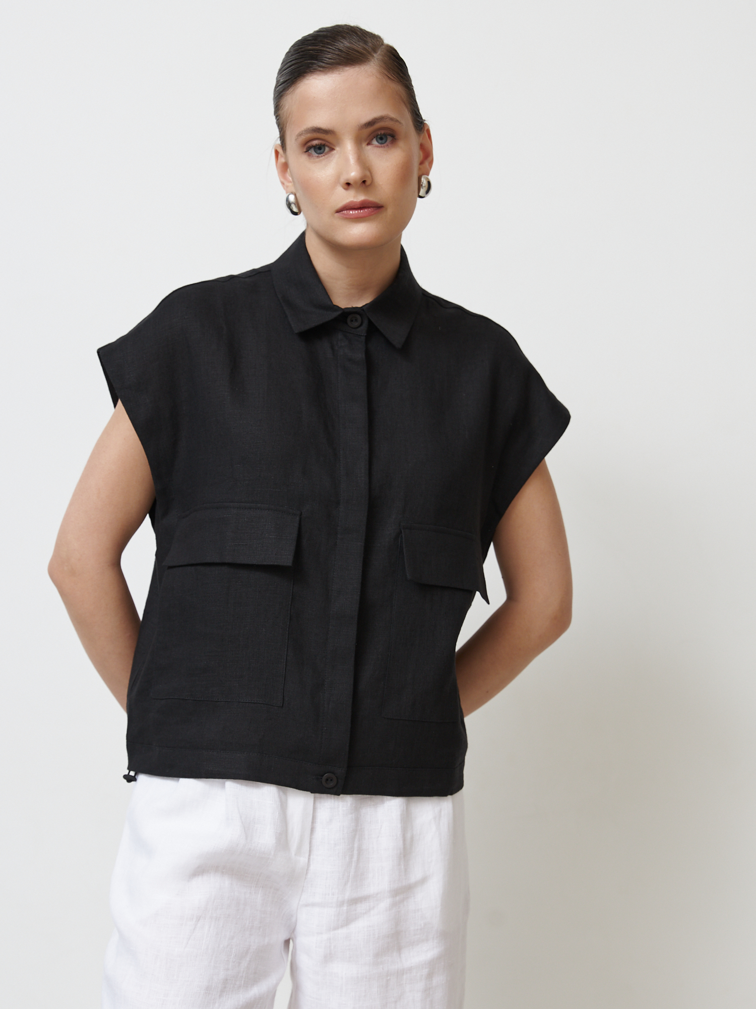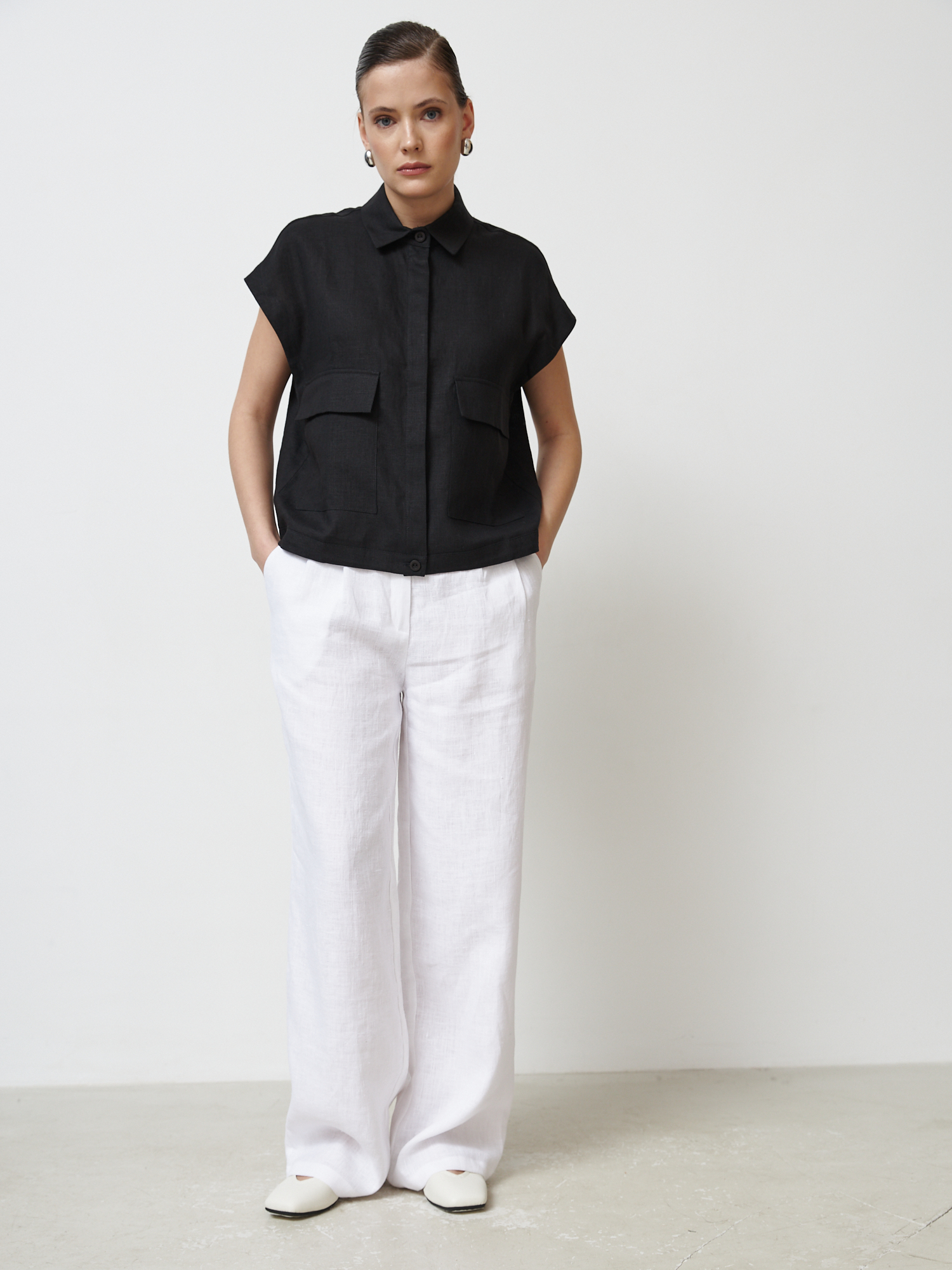 Отлично сочетается с брюками, юбками и шортами из льна. Подходит для повседневных, городских и минималистичных образов.